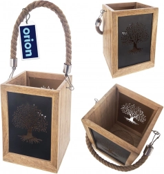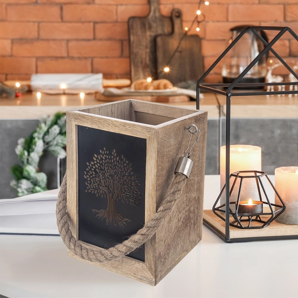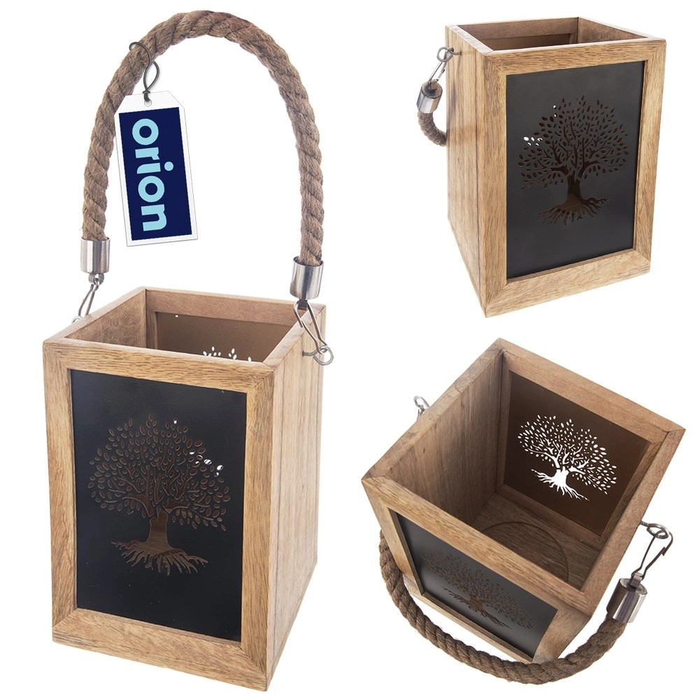 Stylowy drewniany lampion z drewna mango z czarnymi panelami metalowymi i wyciętym motywem drzewa po zapaleniu świecy tworzy efektowną świetlną dekorację. Dzięki solidnemu uchwytowi ze sznura można go łatwo przenosić lub zawiesić, a otwarta górna część zapewnia bezpieczne odprowadzanie ciepła. Idealny do świeczek tealight i klasycznych świec, na balkon, taras oraz do wnętrz.