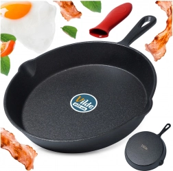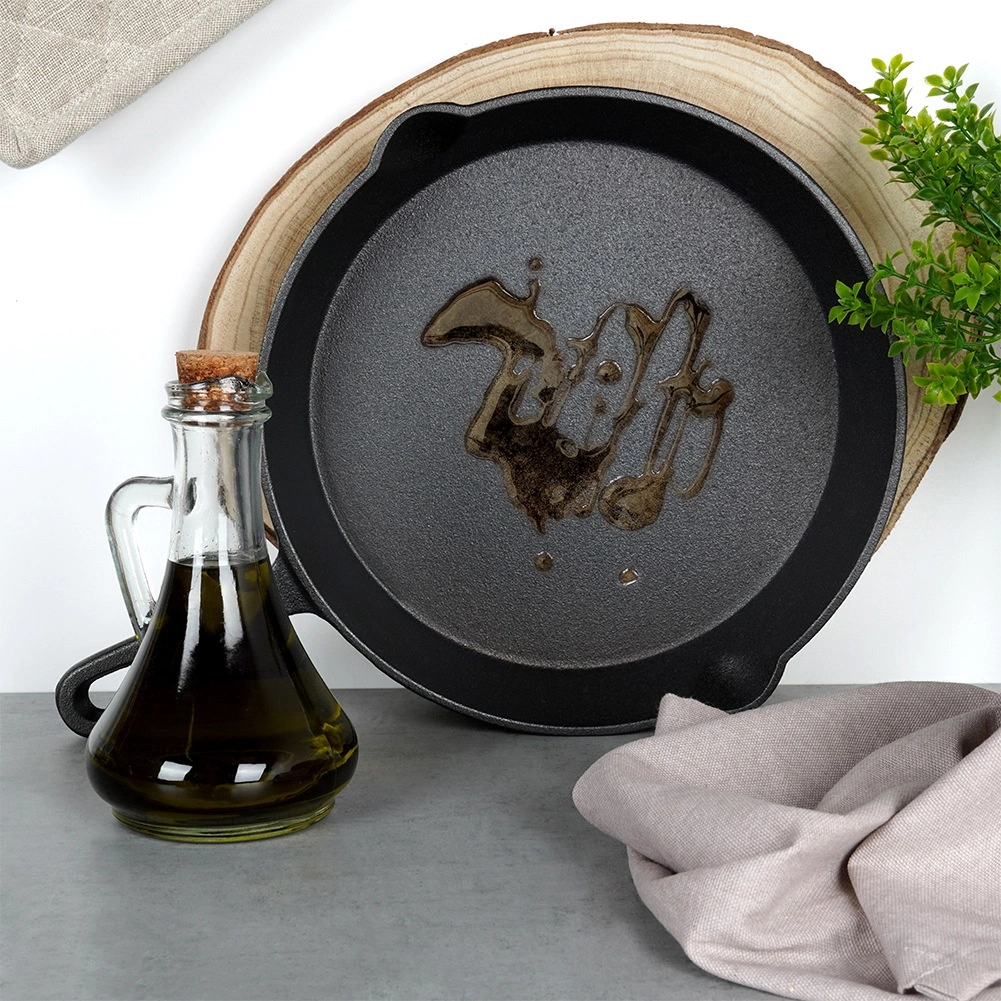 Wskazówka dotycząca pielęgnacji: Po każdym użyciu umyj, dokładnie osusz i lekko natłuść olejem. Regularne oliwienie chroni żeliwo przed korozją i zapewnia długą żywotność. Patelnia nie ma żadnej powłoki nieprzywierającej.
