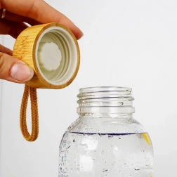 Naturalna bambusowa zakrętka z silikonową wkładką uszczelniającą zapobiega przeciekaniu, a tekstylna pętla ułatwia noszenie i zawieszenie na plecaku.