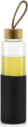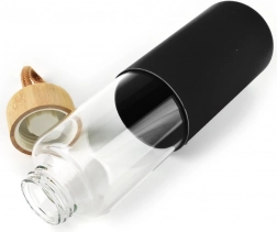 Praktyczna szklana butelka o pojemności 600 ml z bambusową zakrętką i tekstylną pętlą do noszenia jest idealna na co dzień. Wykonana z wytrzymałego szkła borokrzemowego, dzięki czemu nadaje się do gorących i zimnych napojów. Silikonowe etui ochronne w czarnym kolorze poprawia chwyt i chroni przed stłuczeniem, a uszczelniające pierścienie silikonowe w zakrętce zapewniają niezawodną szczelność.