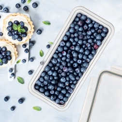 Niski profil i płaska pokrywka oszczędzają miejsce w lodówce oraz umożliwiają bezpieczne układanie kilku pojemników jeden na drugim.