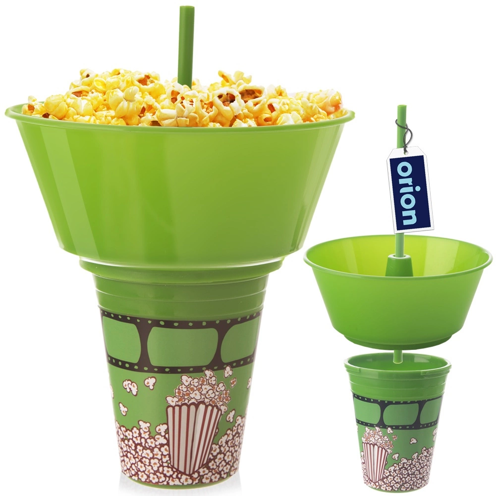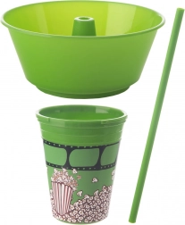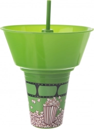 Praktyczne rozwiązanie 2w1 łączy dolny kubek na napój i odpinaną górną miskę na popcorn lub inne przekąski. Zintegrowana słomka pośrodku pozwala pić bez przerywania zabawy, a miska mieści wystarczająco dużo smakołyków do wygodnego podjadania. Zielone wykończenie z motywem popcornu świetnie wygląda w domu i w drodze do kina.