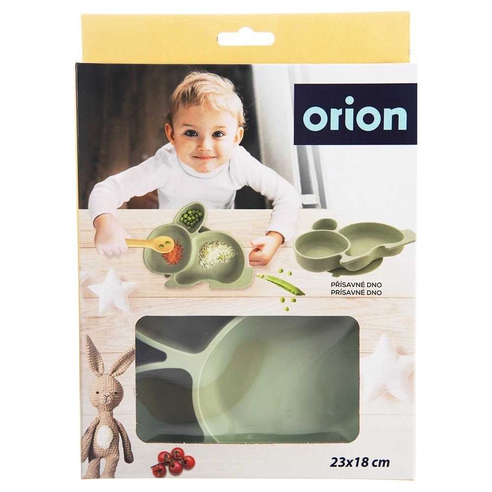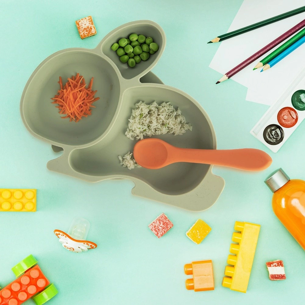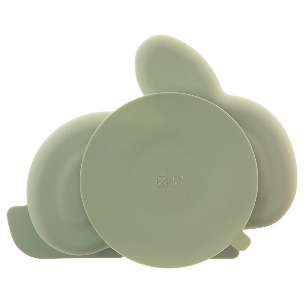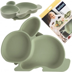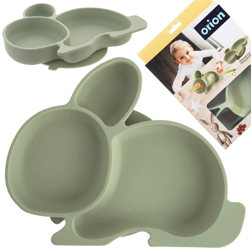 Praktyczny dziecięcy talerzyk z trzema przegródkami w kształcie króliczka, ułatwiający wygodne serwowanie posiłków i przekąsek. Dzięki mocnej przyssawce stabilnie trzyma się stołu, odporny na temperatury od -20 °C do +120 °C i nadaje się do zmywarki, mikrofalówki oraz zamrażarki. Wykonany z wysokiej jakości silikonu w zielonym kolorze.
