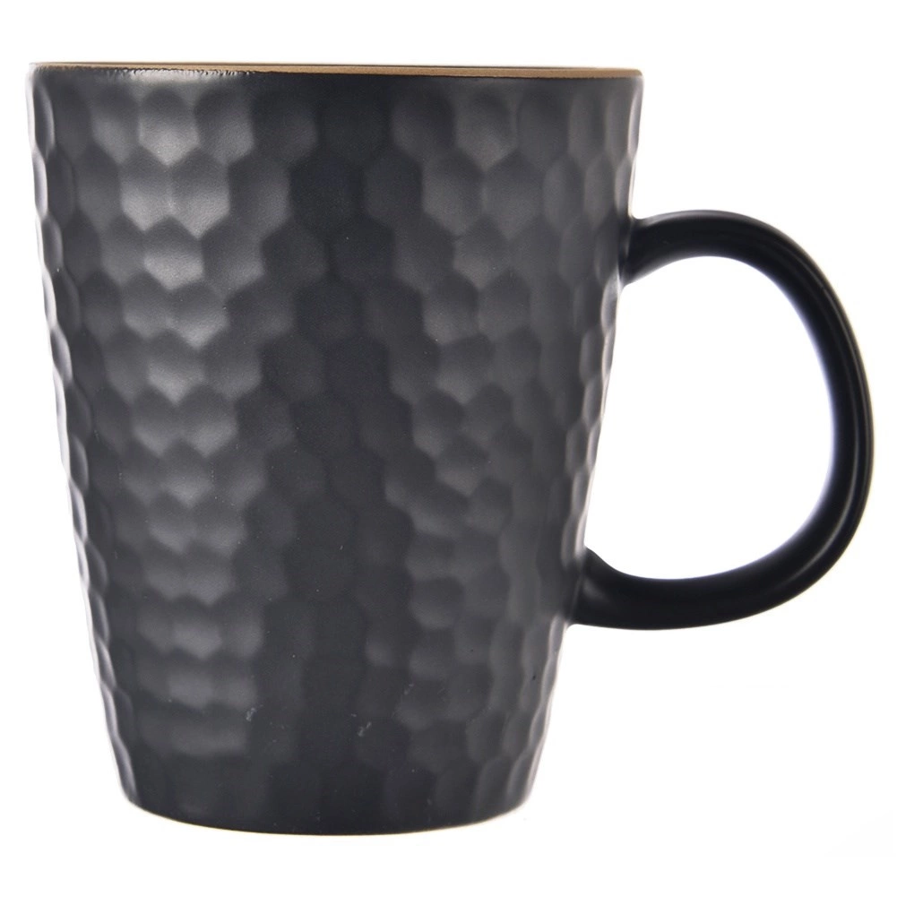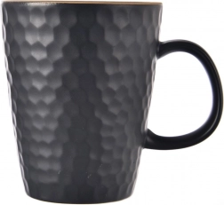 Stylowy czarny kubek z wysokiej jakości kamionki o pojemności 420 ml z reliefem przypominającym plaster miodu. Oferuje wygodne ucho, nowoczesny matowy wygląd i jest odpowiedni do zmywarki i kuchenki mikrofalowej – idealny na codzienną kawę, herbatę i kakao.