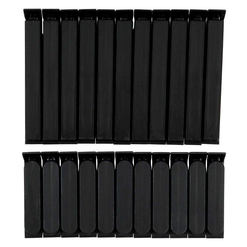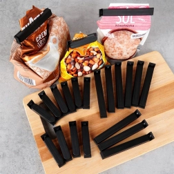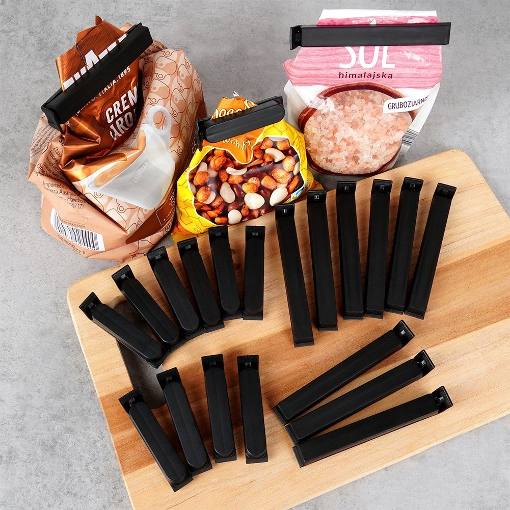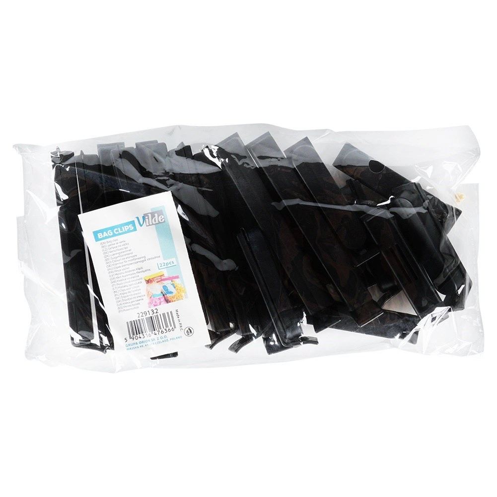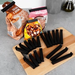 Praktyczny zestaw 22 klipsów do torebek w dwóch rozmiarach niezawodnie zamknie kawę, przyprawy, mrożonki i makarony. Trwałe plastikowe klipsy w czarnym kolorze zapewniają szczelne zamknięcie, chronią zawartość przed wilgocią i powietrzem oraz pomagają utrzymać świeżość i porządek w spiżarni. Łatwa obsługa jednym ruchem i kompaktowe wymiary dla wygodnego przechowywania.