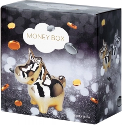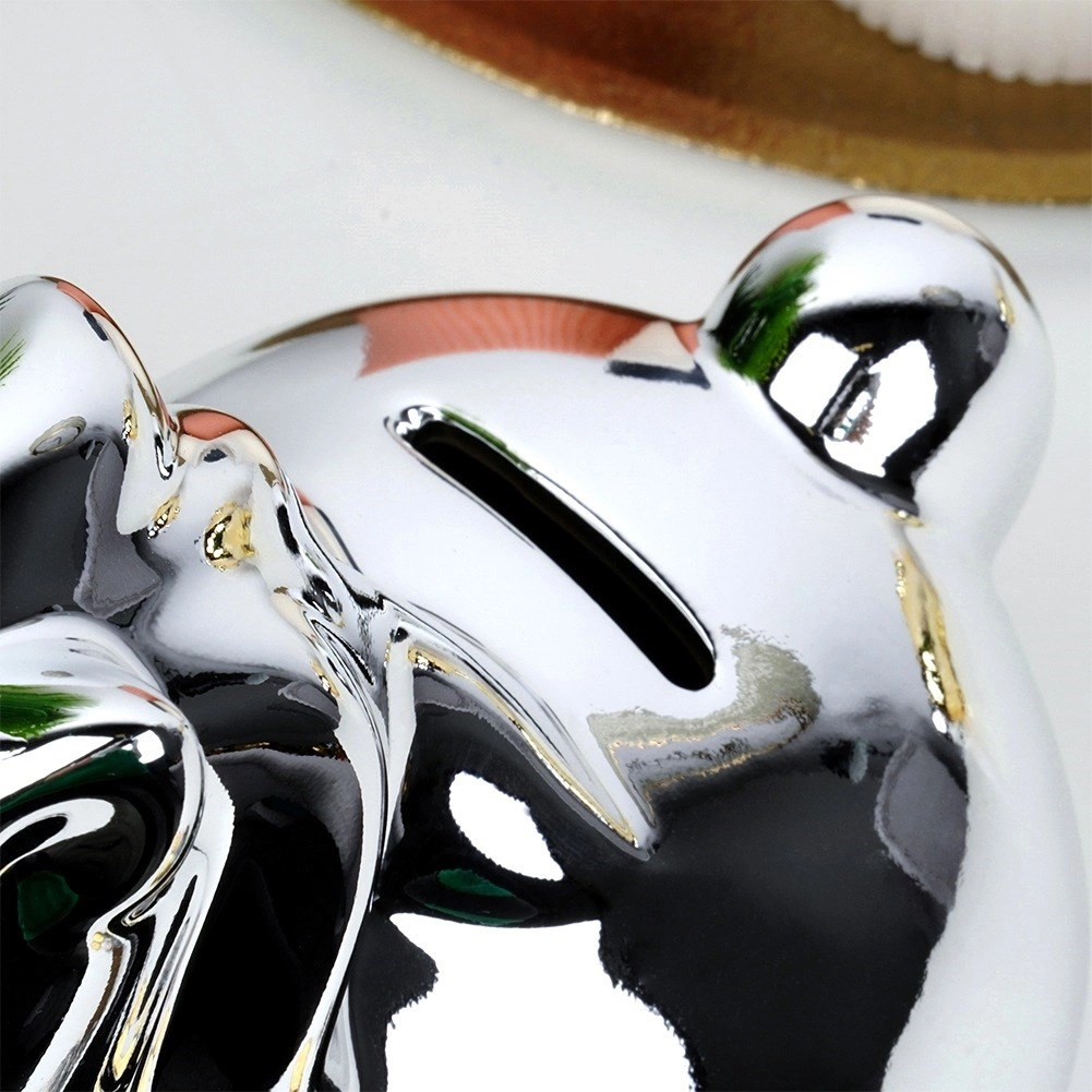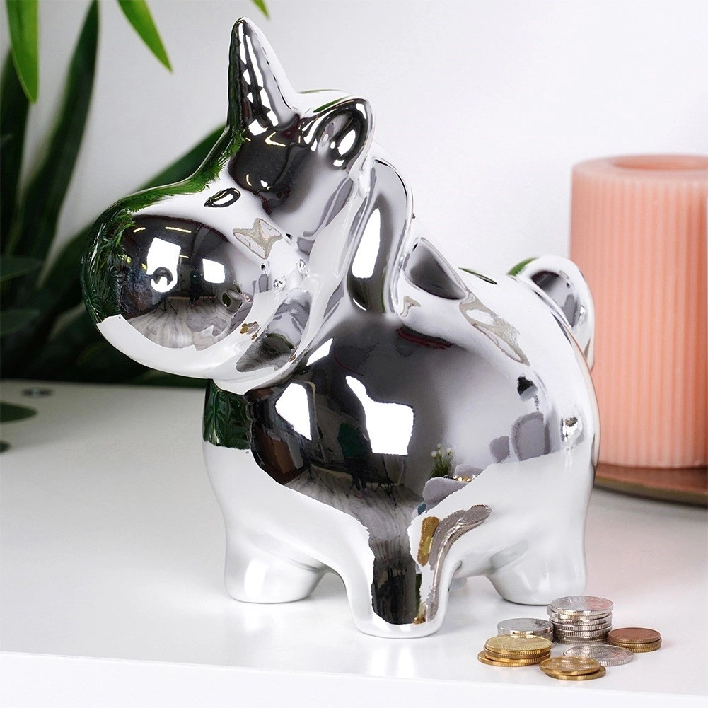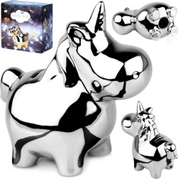 Stylowa skarbonka w kształcie jednorożca z srebrnej ceramiki o lustrzanym połysku. Świetnie służy do przechowywania monet i banknotów, a jednocześnie jest dekoracyjnym dodatkiem w nowoczesnym stylu. Dzięki praktycznemu dolnemu zamknięciu z łatwością ją opróżnisz bez rozbijania. Idealny prezent dla dzieci i dorosłych oraz elegancki dodatek do wnętrza.