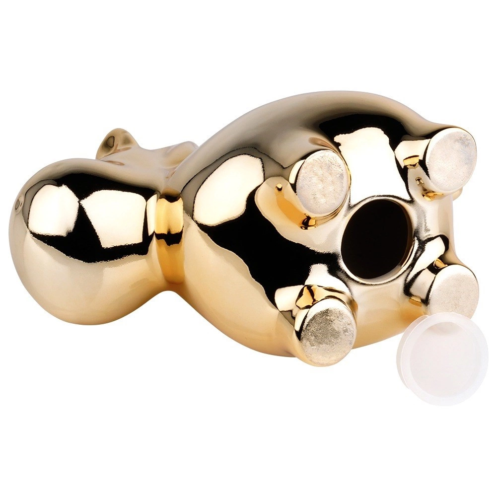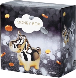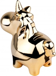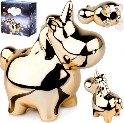Stylowa skarbonka w kształcie jednorożca z lustrzanym złotym połyskiem doskonale uzupełni wnętrze i pomoże w oszczędzaniu monet i banknotów. Ma praktyczny odkręcany korek w dolnej części, więc nie trzeba jej rozbijać. Eleganckie ceramiczne wykonanie w stylu glam sprawdzi się także jako prezent dla dzieci i dorosłych.