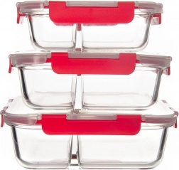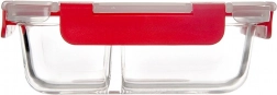 Wykonane z szkła borokrzemowego odpornego na temperatury od -20 °C do 300 °C. Pokrywka z czerwoną silikonową uszczelką i czterema klipsami typu snap-lock zapewnia szczelne zamknięcie i dłuższą świeżość. Uszczelnienie między przegródkami zapobiega niepożądanemu przelewaniu.
