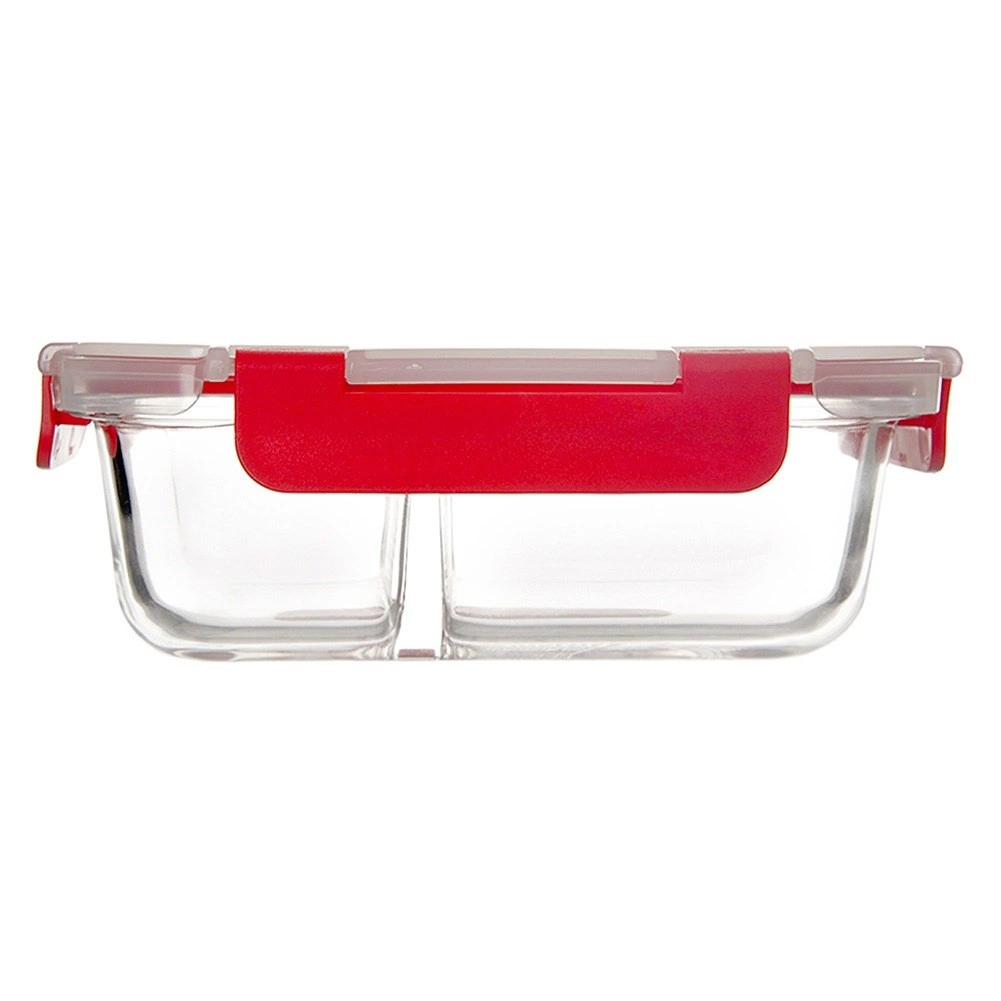 Praktyczny szklany lunch box o pojemności 950 ml z dwiema oddzielnymi komorami utrzyma Twoje jedzenie w porządku i bez mieszania smaków. Wytrzymałe szkło borokrzemowe, cztery solidne klipsy i silikonowa uszczelka zapewniają 100% szczelność i świeżość. Odpowiedni do mikrofalówki (bez pokrywki), piekarnika (bez pokrywki), zamrażarki i zmywarki.