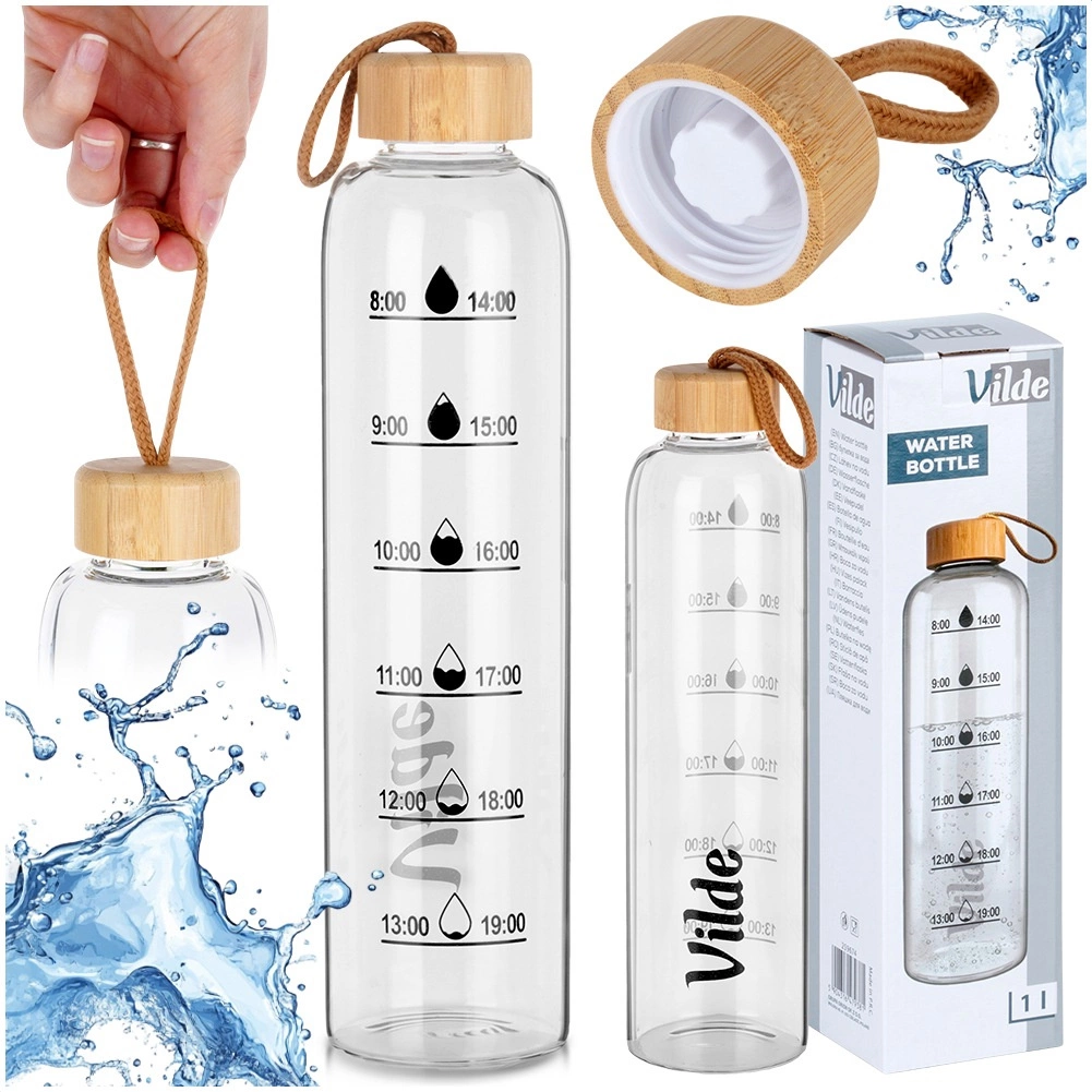 Stylowa szklana butelka na wodę o pojemności 1 l z wytrzymałego szkła borokrzemowego z bambusową zakrętką na gwint i tekstylną pętlą. Dzięki silikonowej uszczelce nie przecieka, a znaczniki czasowe na korpusie motywują do regularnego nawadniania w ciągu dnia. Odpowiednia do gorących i zimnych napojów, łatwa w utrzymaniu i bezpieczna do zmywarki.