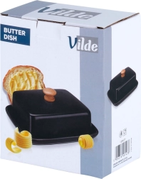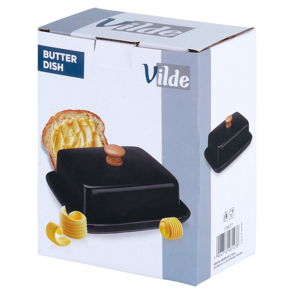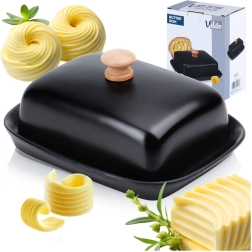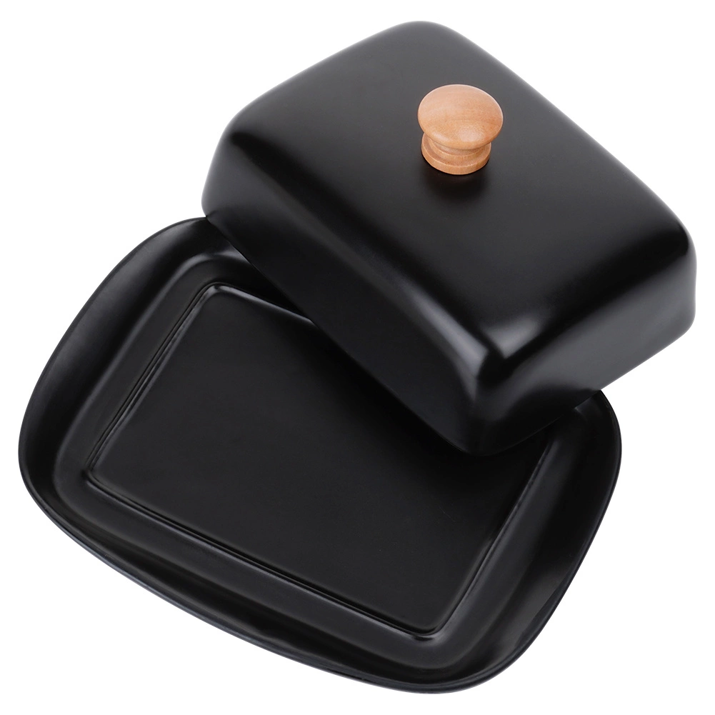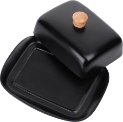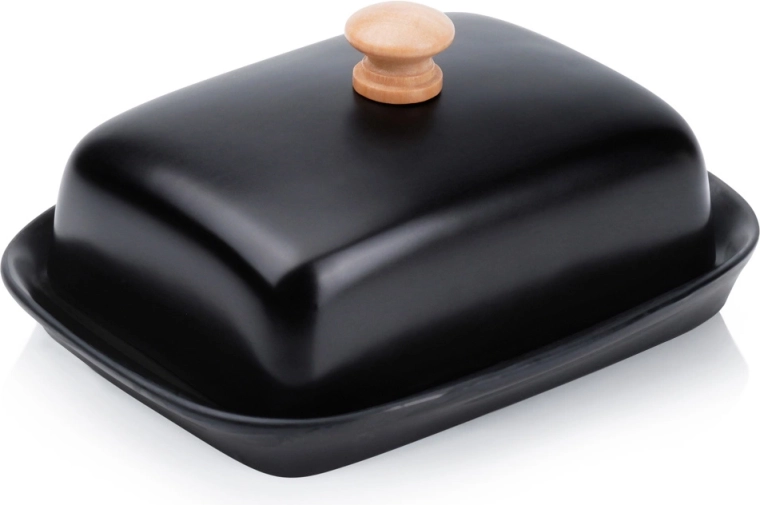 Ta stylowa maselniczka z wysokiej jakości ceramiki w czarnym kolorze jest idealna do codziennego użytku w domu oraz do serwowania na stole. Drewniany uchwyt na pokrywce umożliwia wygodne podnoszenie, a ściśle przylegająca osłona chroni masło przed wysychaniem i obcymi zapachami.