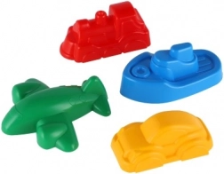 Pociąg, statek, samolot i auto w żywych kolorach zachęcają dzieci do tworzenia i zabawy w piasku oraz nad wodą.
