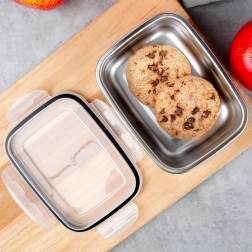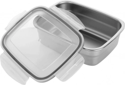 Przezroczysta pokrywka z gumową uszczelką i 4 solidnymi klipsami zapewnia niezawodne, nieprzeciekające zamknięcie. Miska ze stali nierdzewnej lepiej utrzymuje pożądaną temperaturę potraw – ciepłych i zimnych – oraz jest odporna na zapachy i plamy. Pudełko można wygodnie myć w zmywarce.