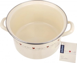 Stylowy emaliowany garnek TONCA o pojemności 4 l i średnicy 22 cm w kremowym kolorze z delikatnym motywem serduszek jest idealny do codziennego gotowania i duszenia. Ma solidne ergonomiczne uchwyty, nierdzewne obrzeże i jest odpowiedni na wszystkie typy kuchenek, w tym indukcję, a także do piekarnika. Dla łatwej pielęgnacji można go myć w zmywarce.