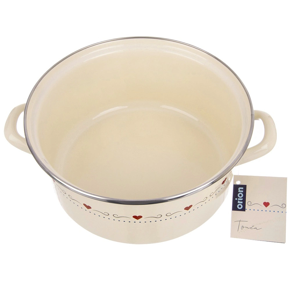 Ulubiony retro design i praktyczność w jednym: emaliowany garnek TONCA o średnicy 24 cm i wysokości 11 cm świetnie sprawdzi się do zup, sosów i dań duszonych. Kremowe wykończenie z subtelnymi serduszkami ozdobi każdą kuchnię, a dzięki szerokiemu otworowi mieszanie i serwowanie jest maksymalnie wygodne.