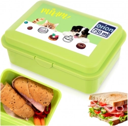 Praktyczne pudełko śniadaniowe o pojemności 750 ml w zielonym kolorze z uroczym motywem zwierzątek jest idealne na kanapki, przekąski i drobiazgi. Ma wymiary 18 × 13 × 7 cm, to lekka i wytrzymała opcja dla dzieci do szkoły i na wycieczki. Bezpieczne materiały do kontaktu z żywnością, łatwe zamknięcie na klips oraz możliwość mycia w zmywarce i używania w kuchence mikrofalowej (z otwartą pokrywką do 400 W).