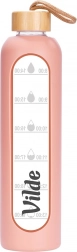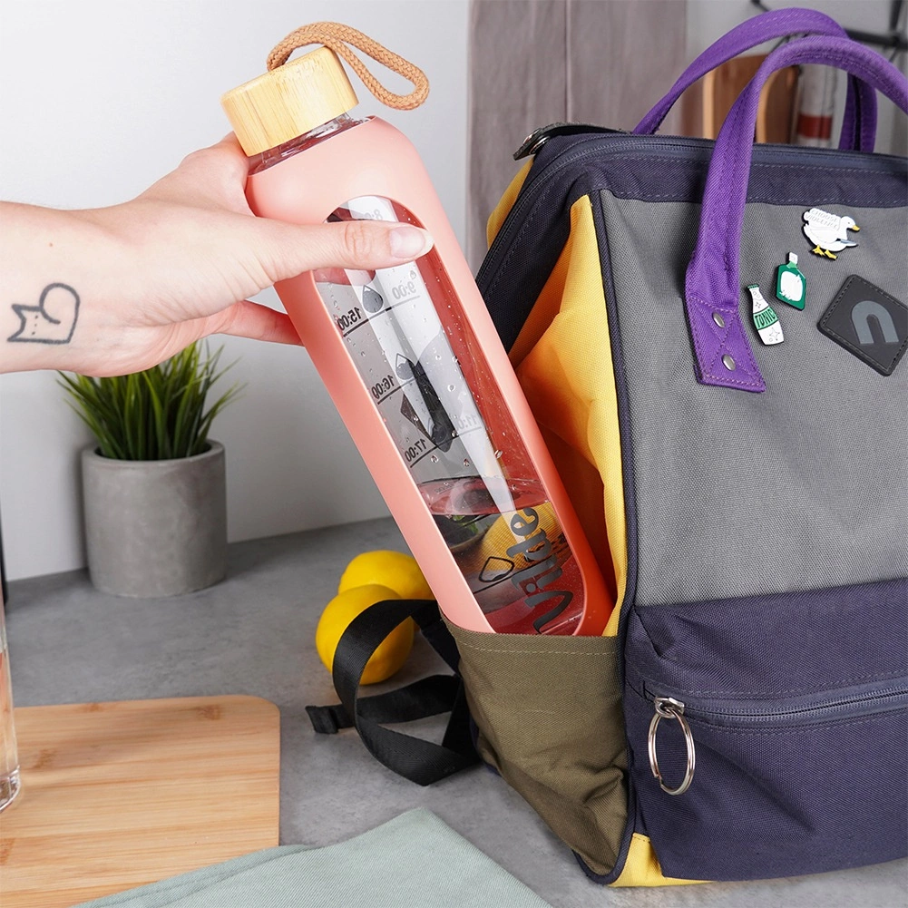 Dbaj o nawodnienie w dobrym stylu. Ta łososiowo-różowa butelka łączy elegancki design i funkcjonalność: wytrzymałe szkło borokrzemowe, bezpieczna bambusowa zakrętka z tekstylną pętelką oraz silikonowy pokrowiec dla pewnego chwytu i ochrony przed stłuczeniem. Dzięki znacznikom czasu łatwo monitorujesz spożycie wody przez cały dzień.