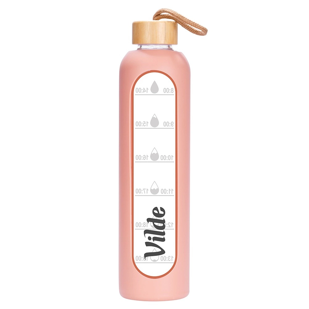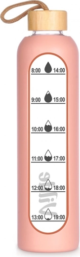 Stylowa szklana butelka na wodę o pojemności 1 l z bambusową zakrętką, silikonowym ochrannym pokrowcem oraz skalą czasową motywującą do regularnego picia. Wykonana z borokrzemowego szkła odpornego na temperatury, z mocnym uszczelnieniem przeciw przeciekaniu i pętelką do łatwego noszenia – idealna na co dzień, do pracy, w podróży i na sport.