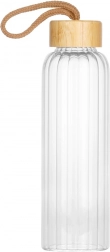 Stylowa szklana butelka na wodę o pojemności 500 ml z bambusową zakrętką i tekstylną pętelką do wygodnego noszenia. Wykonana z szkła borokrzemowego odpornego na szoki termiczne, dzięki czemu nadaje się do gorących i zimnych napojów. Dzięki silikonowej uszczelce butelka jest niezawodnie szczelna, a jej ryflowane szkło zapewnia pewny chwyt i nowoczesny wygląd. Korpus można myć w zmywarce (bez zakrętki).