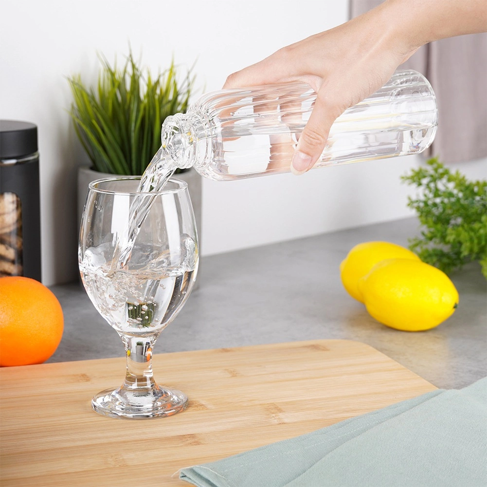 Pionowe ryflowanie szkła poprawia przyczepność i nadaje butelce nowoczesny wygląd odpowiedni do biura i w podróży.