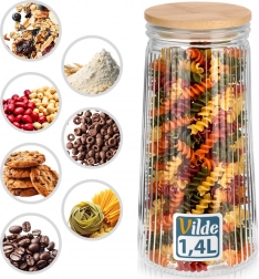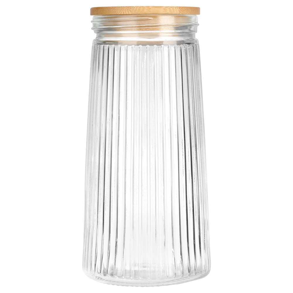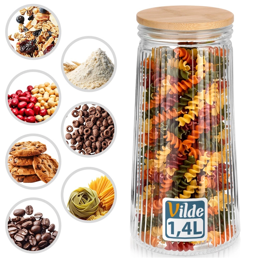 Utrzymaj spiżarnię w porządku, a produkty dłużej świeże. Szklany pojemnik o pojemności 1,4 l łączy szkło borokrzemowe z bambusową pokrywką i silikonową uszczelką, zapewniając niezawodną hermetyczność. Przezroczyste korpus z pionowym żłobieniem nadaje nowoczesny wygląd i umożliwia natychmiastową kontrolę zawartości.
