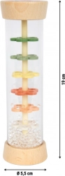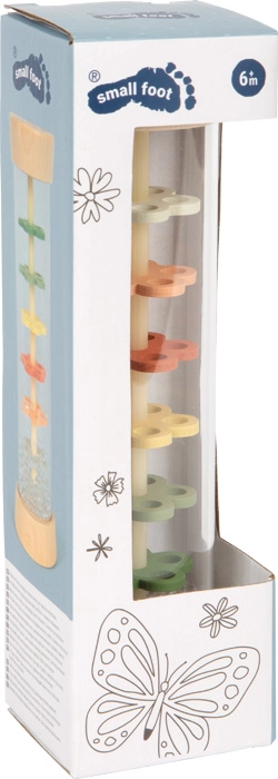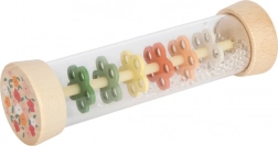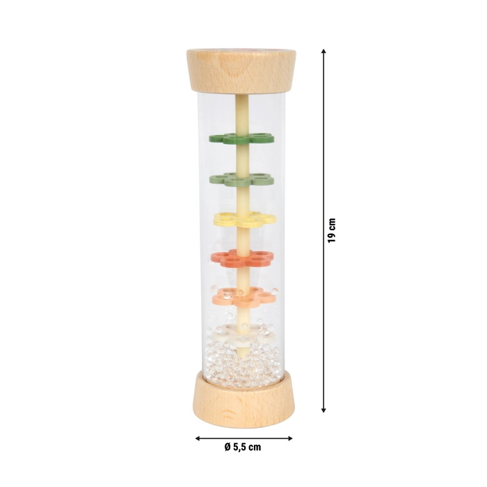 Deszczowa pałeczka Mali przyjaciele przenosi dzieciom magię spadających kropel prosto do rąk. Błyszczące koraliki powoli przesypują się przez kolorowe kwiatowe płytki w przezroczystej tubie, tworząc równomierny, relaksujący dźwięk. Idealna na chwile wyciszenia, do pierwszych prób rytmicznych oraz jako kolorowa grzechotka.