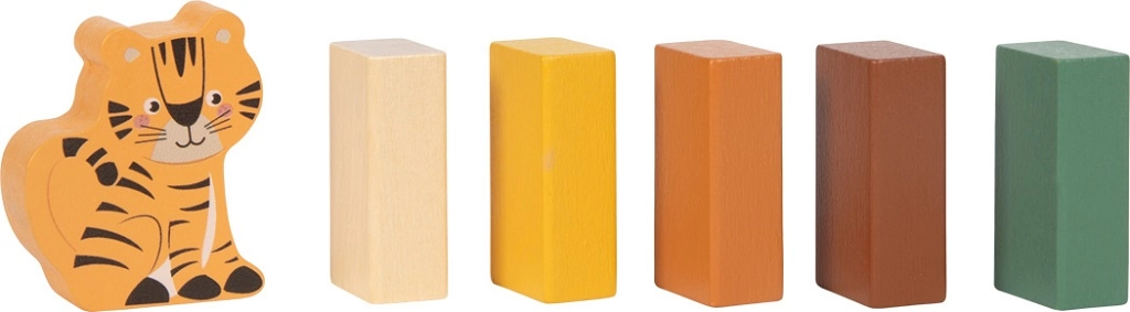 Kolorowe cegiełki, stabilna rama, dwie pałeczki i figurka tygrysa – wszystko z 100% drewna FSC® o gładkim wykończeniu.