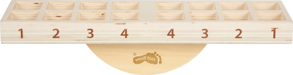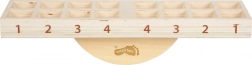 Numerowana deska równoważna na półokrągłej podstawie pozwala dzieciom eksperymentować z rozmieszczeniem klocków i natychmiast obserwować wpływ na równowagę.