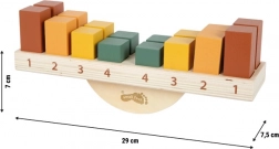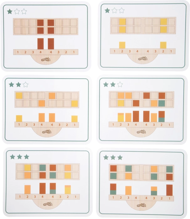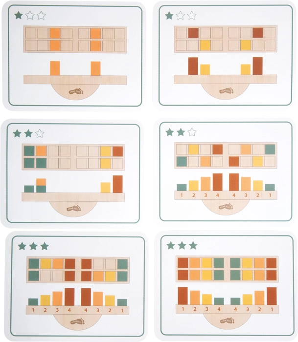 Ta montessoriańska gra równoważna z wysokiej jakości drewna certyfikowanego FSC wprowadza dzieci w zasady równowagi, ciężaru i dźwigni. Dzieci umieszczają kolorowe klocki na oznaczonych pozycjach z numerami i obserwują, jak zmienia się równowaga. Mogą tworzyć własne konstrukcje lub realizować zadania z kart o różnym poziomie trudności.