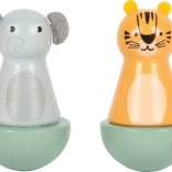 Dwie zdejmowane drewniane figurki trzymają się pewnie dzięki magnesom i podczas odtwarzania łagodnie się obracają. Dzieci mogą bawić się nimi także osobno.
