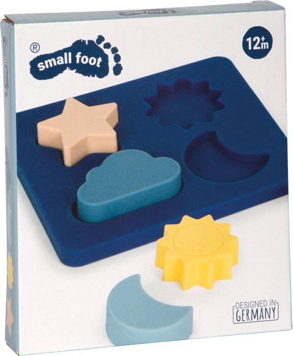 Silikonowe puzzle small foot zostały zaprojektowane dla małych rączek i ciekawych główek. Cztery pastelowe kształty – słońce, księżyc, gwiazda i chmurka – dzieci łatwo chwytają i wkładają do podstawy z różnych stron, co wspiera kreatywność i naturalną naukę kształtów oraz kolorów. Materiał z silikonu spożywczego bez BPA jest delikatny w dotyku, bezzapachowy i całkowicie bezpieczny także przy kontakcie z ustami.