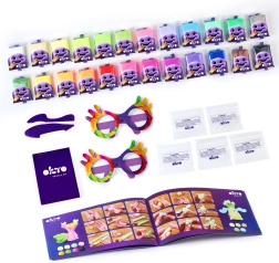 - 24× saszetka masy (10 g), ilustrowana instrukcja, narzędzia do modelowania, 5× zamykany woreczek, 2× papierowe okulary