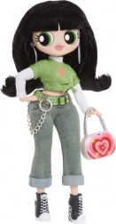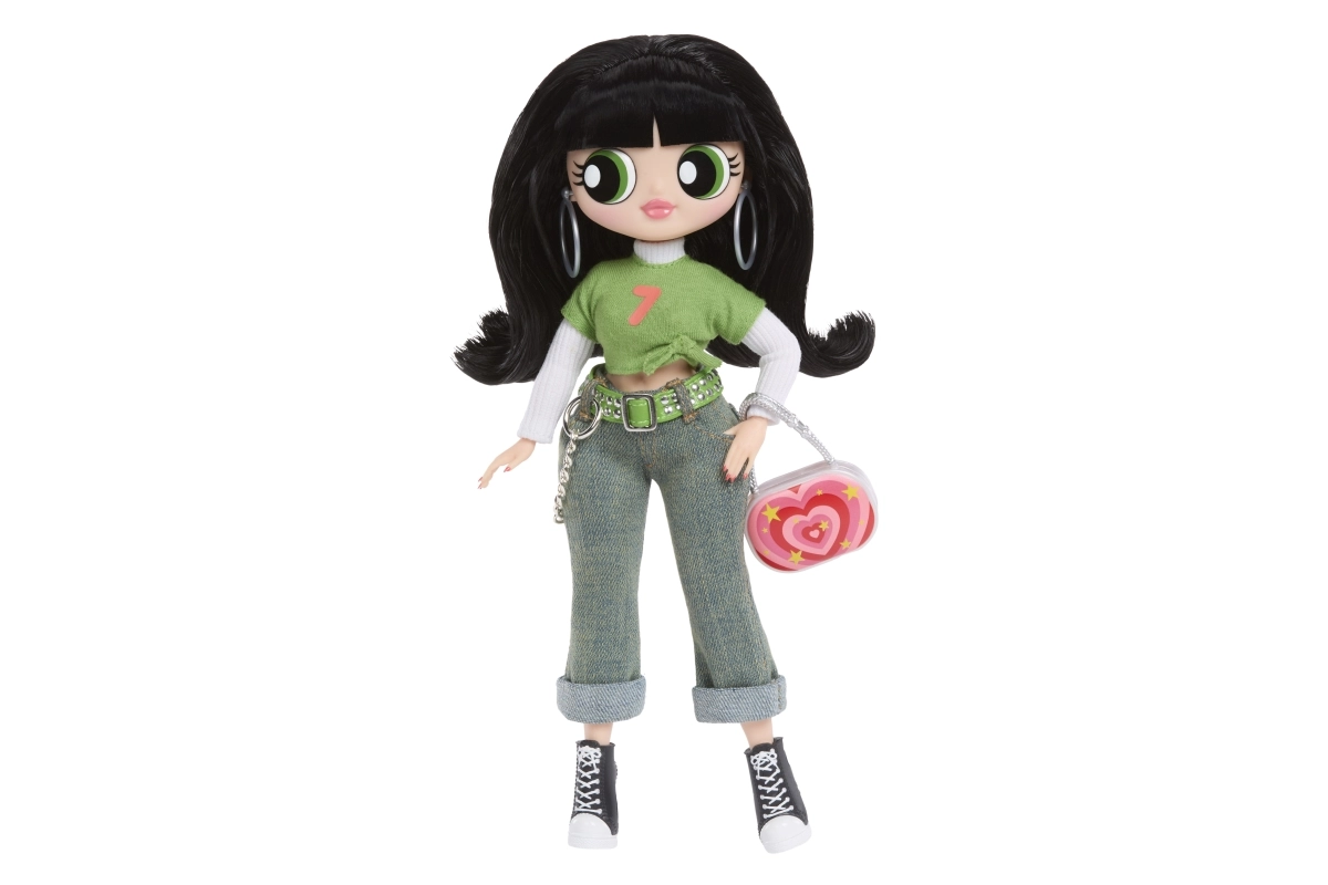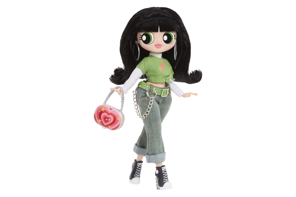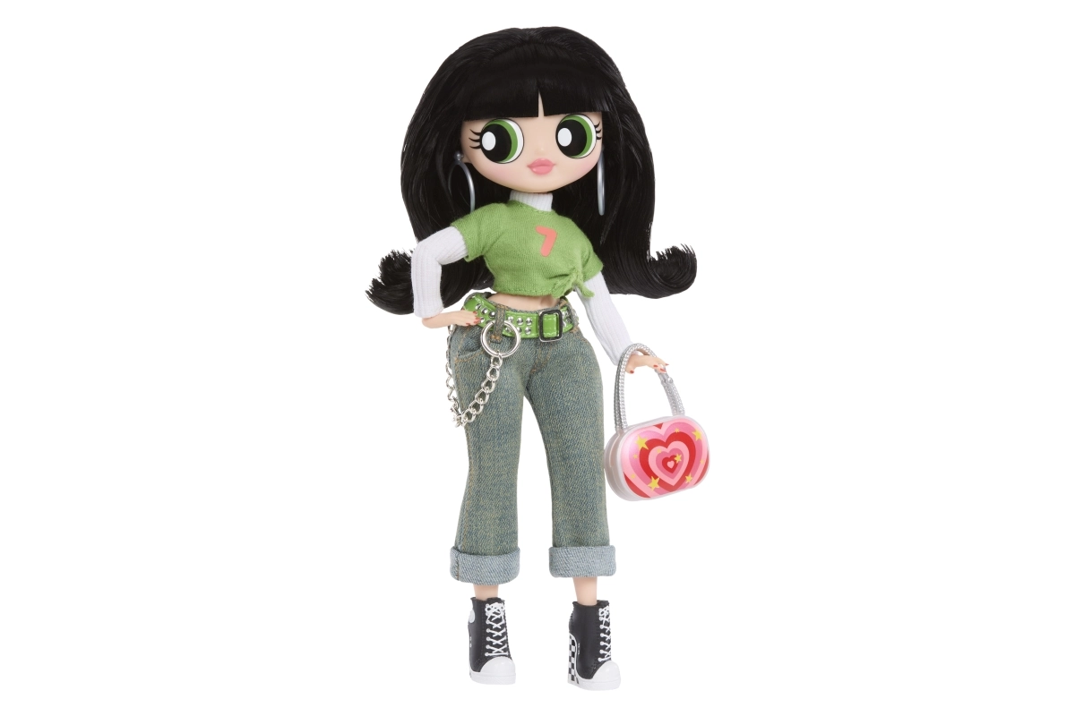 Zielony crop top, dżinsy z łańcuszkiem i czarne tenisówki uzupełnia wyrazista torebka i kolczyki – kultowy look Buttercup w wydaniu L.O.L.
