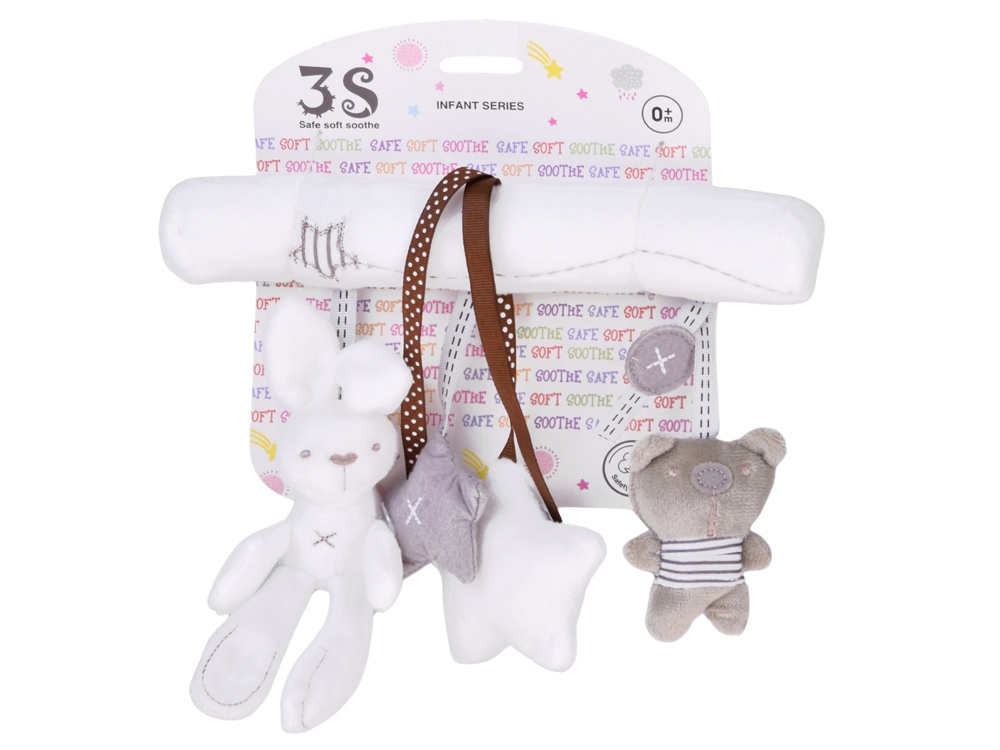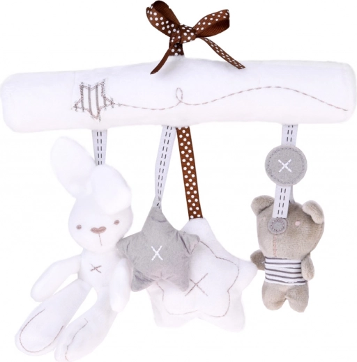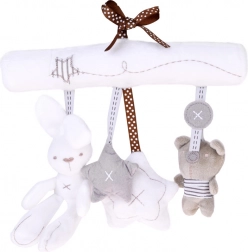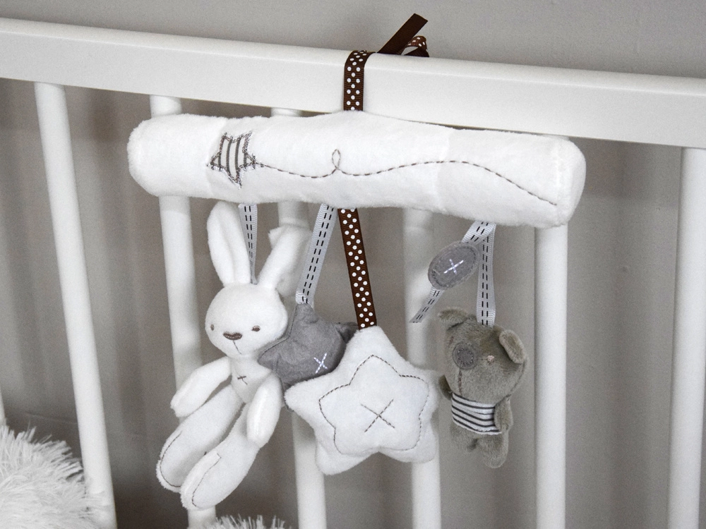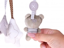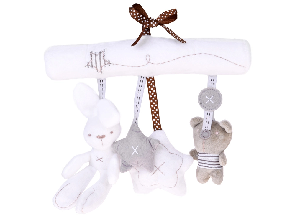 Urocza zawieszka w neutralnych kolorach ucieszy maluszka w domu i w podróży. Łatwo przymocujesz ją do łóżeczka lub wózka za pomocą wstążek. Oferuje miękki, puszysty plusz, delikatną stymulację zmysłów oraz zabawne dźwięki: po naciśnięciu brzuszka króliczka rozbrzmiewa krótka melodia, biała gwiazdka ma piszczałkę, a miś działa jako grzechotka.