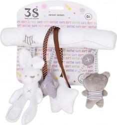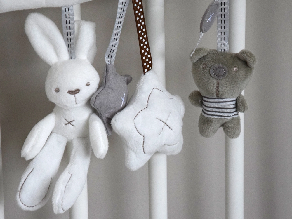 • 3 elementy wiszące – króliczek z melodią, gwiazdka z piszczałką, miś jako grzechotka.