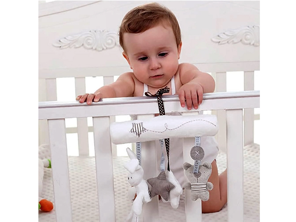 Ta miękka zawieszka łączy kojący design w biało-szarych tonach z funkcjonalną stymulacją sensoryczną. Dzięki uniwersalnym wstążkom szybko przymocujesz ją do łóżeczka, wózka czy pałąka, zapewniając maluszkowi rozwijającą zabawę podczas odpoczynku i na spacerze.