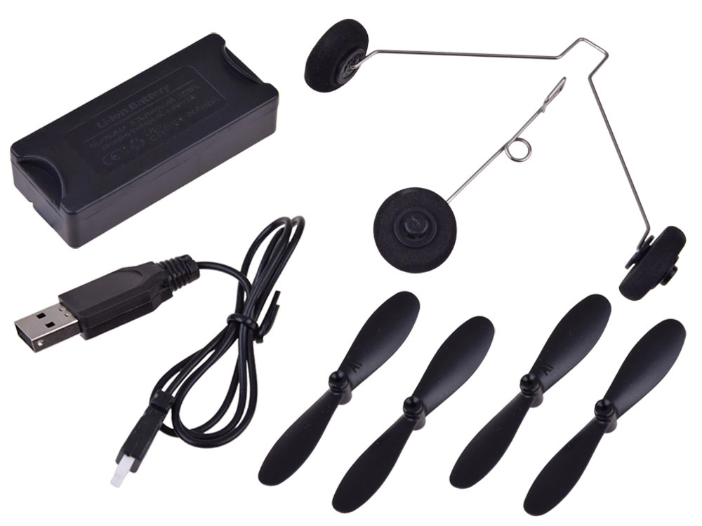 W zestawie znajdziesz zapasowe śmigła, podwozie, przewód USB oraz nadajnik RC 2,4 GHz. Wystarczy złożyć, naładować i lecieć.