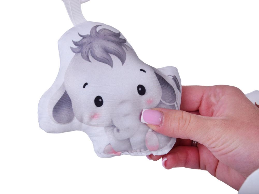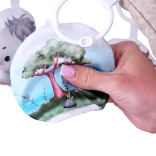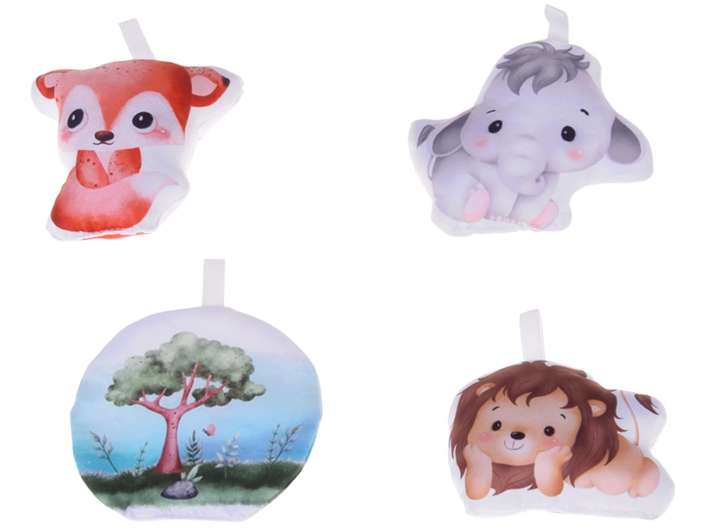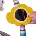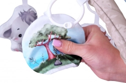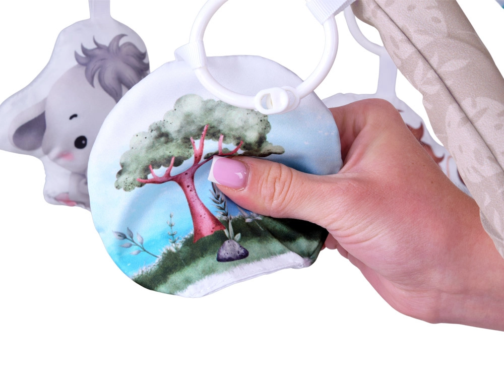 Uroczy lisek, lew, słonik, szeleszczące drzewko oraz bezpieczne lusterko można łatwo przestawiać lub odpiąć. Dziecko poznaje różne kształty, faktury i dźwięki, ćwicząc przy tym małą motorykę.