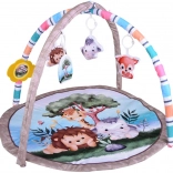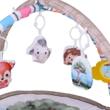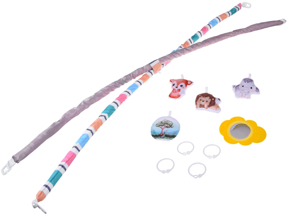 Dwa wyściełane, sprężyste pałąki z zawieszanymi pluszowymi zabawkami i lusterkiem zachęcają dziecko do sięgania, chwytania i kopania – idealne do treningu koordynacji oko–ręka oraz wzmacniania mięśni.