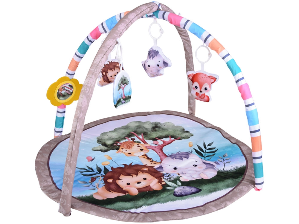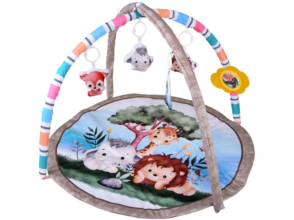 Ta okrągła mata edukacyjna z motywami safari (lew, słoń, żyrafa) oferuje miękkie i przytulne środowisko, które pobudza ciekawość i samodzielne odkrywanie. Dwa wyściełane, krzyżujące się pałąki z zawieszkami i bezpiecznym, niezniszczalnym lusterkiem zachęcają maluszka do sięgania, chwytania i kopania, wspierając motorykę dużą i małą.