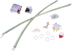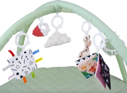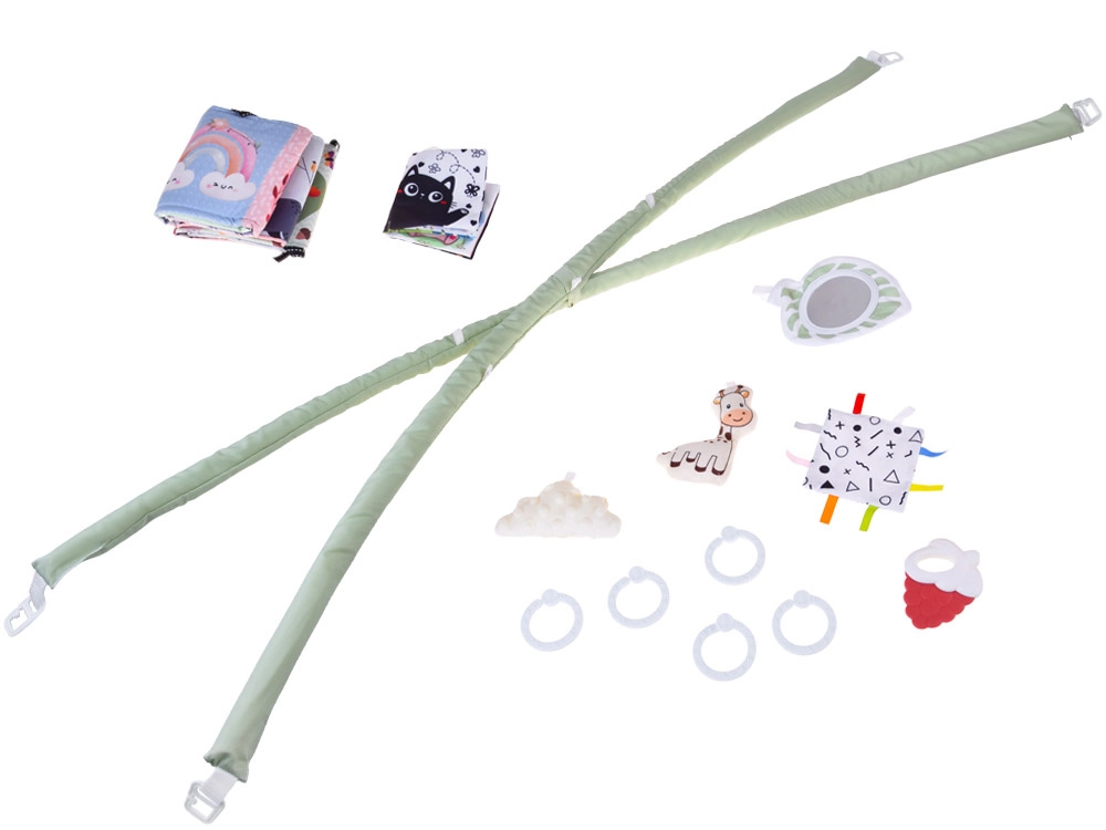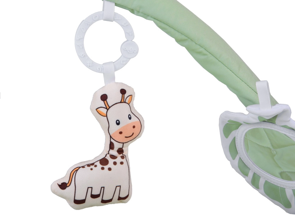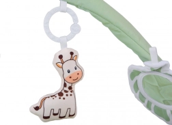 Dwa elastyczne pałąki można łatwo odpiąć do prania lub na czas podróży. Zawieszki – gryzak, chmurka, żyrafa i szeleszczące kwadraty – zachęcają do sięgania oraz rozwijają zmysły.