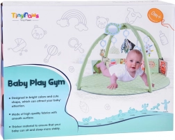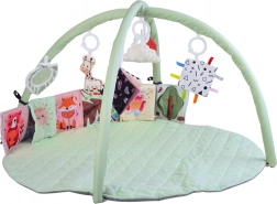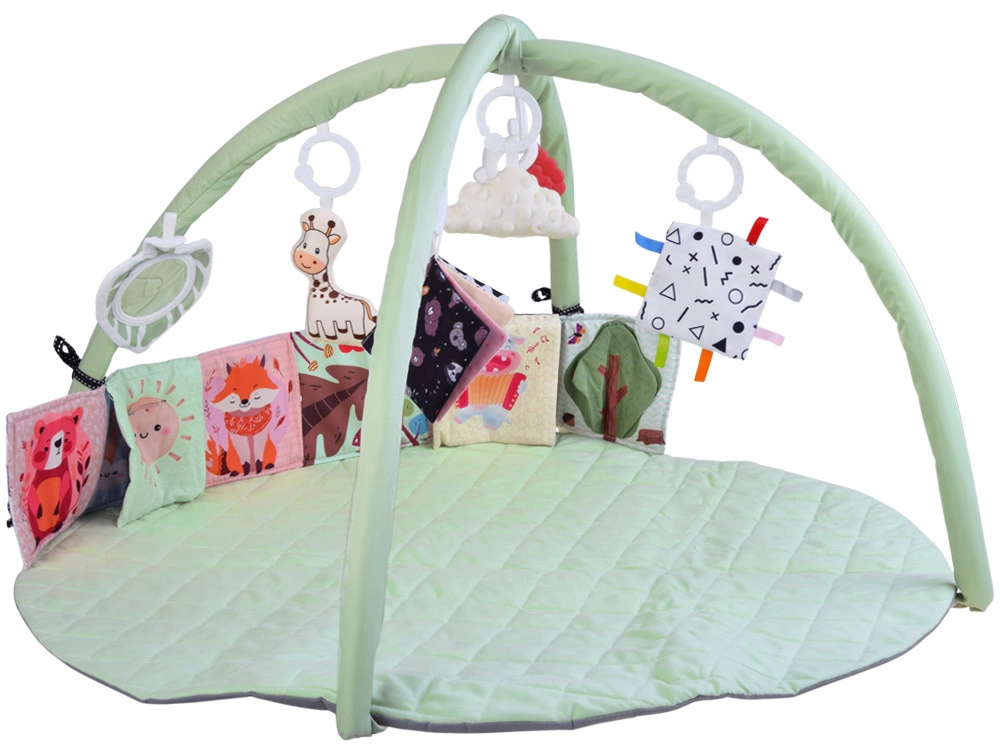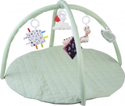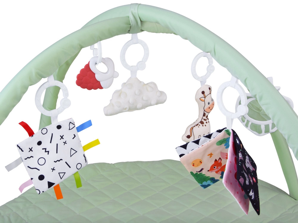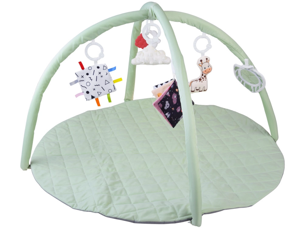 Ta okrągła, delikatnie amortyzowana mata w pastelowym, miętowym kolorze tworzy bezpieczne i wygodne miejsce do codziennego odkrywania. Dwa elastyczne pałąki z łatwym odpinaniem umożliwiają szybką pielęgnację oraz kompaktowe złożenie na czas podróży. Różnorodne faktury, szeleszczące elementy i kontrastowe wzory naturalnie rozwijają wzrok, słuch i dotyk, a zawieszane zabawki motywują do sięgania, kopania i przewracania się.