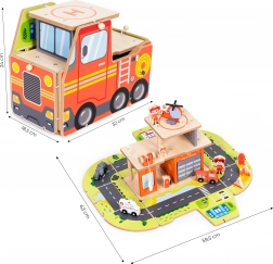 Przemyślana składana konstrukcja 2w1 umożliwia zabawę w przestronnej stacji, a po skończonej zabawie łatwe zamknięcie jej w formie wozu strażackiego – idealne do przechowywania i przenoszenia. Dwupiętrowa stacja z garażem, lądowiskiem i tematycznymi detalami zachęca do realistycznej zabawy w ratowników.