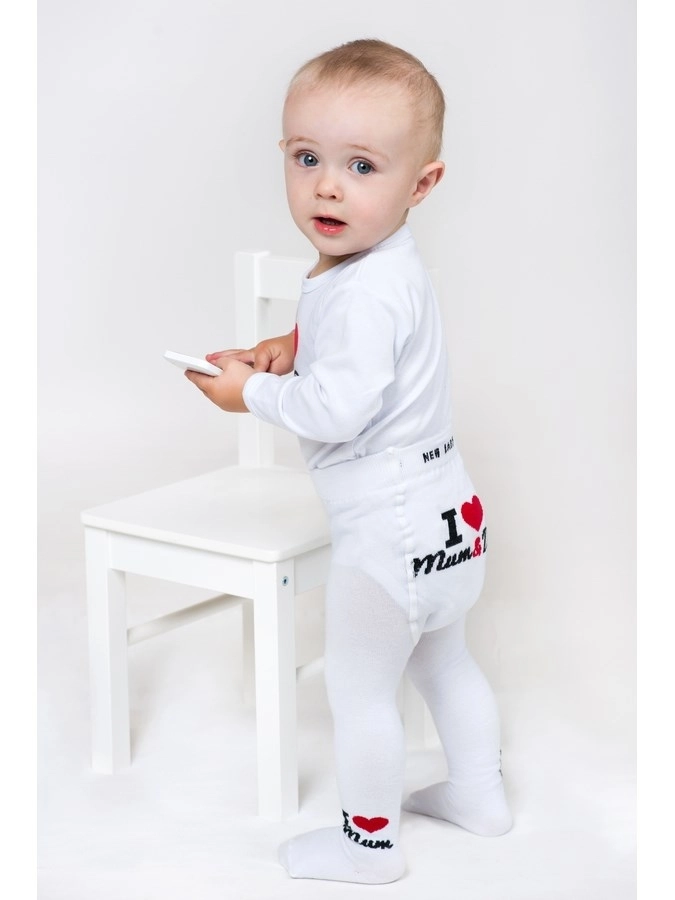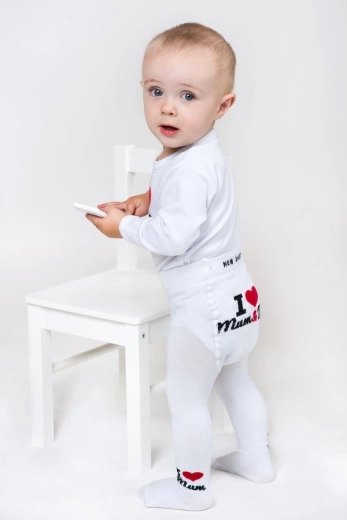 Odkryj wygodę i jakość z dziecięcymi rajstopami NEW BABY w białym kolorze. Dzięki wysokiej zawartości bawełny są delikatne dla dziecięcej skóry, a elastyczny materiał świetnie się dopasowuje i zapewnia komfort noszenia przez cały dzień. Uroczy motyw I Love Mum i I Love Dad czyni je świetnym dodatkiem do garderoby każdego małego odkrywcy.