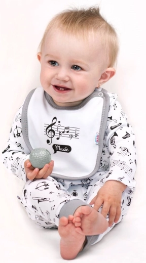 Miękkie i przewiewne niemowlęce półśpiochy New Baby Music z przyjemnej 100% bawełny z zabawnym nadrukiem nut i instrumentów muzycznych. Mają szeroki, nieuciskający pas, zapięcie na napy między nóżkami i są odpowiednie dla chłopców i dziewczynek.