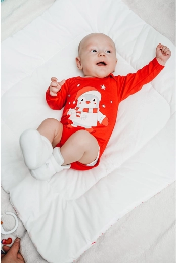 Body niemowlęce New Baby Winter Penguin wyróżnia się przyjemnym, bawełnianym materiałem i radosnym zimowym nadrukiem z pingwinem. Nasycony czerwony kolor nadaje stylizacji świątecznego charakteru, a jednocześnie łatwo łączy się ze spodniami, legginsami czy półśpiochami.