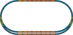 14× 55412 łuk R2 422 mm; 8× 55401 prosta 231 mm; 1× 55406 prosta 231 mm do zacisku; 3× 55400 prosta 239 mm; 1× 55422 BWL; 1× 55423 BWR; 1× 55447 podstawa do zacisku; 1× 55275 zacisk łączący; kabel do podłączenia torów