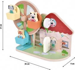 Odkryj zabawną drewnianą zabawkę motoryczną z diabelskim młynem, która łączy zabawę, naukę i rozwój małej motoryki. Trzy urocze postacie – tygrys, zebra i słoń – jeżdżą w kabinkach, podczas gdy dzieci mogą obracać płynną korbką, otwierać drzwiczki domku i odkrywać ukryte obrazki. Wykonana z drewna certyfikowanego FSC 100% dla bezpiecznej i odpowiedzialnej zabawy.