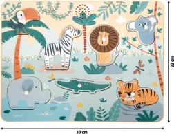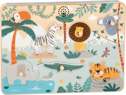 Drewniana układanka wkładana z dźwiękiem zamienia pierwszą naukę w przygodę. Dzieci umieszczają lwa, tygrysa, słonia, zebrę, koalę, tukana i krokodyla we właściwych miejscach, a po podniesieniu elementu usłyszą autentyczny odgłos zwierzęcia. Wysoka jakość wykonania z certyfikowanego drewna FSC0ae jest przyjemna w dotyku i przyjazna dla natury.