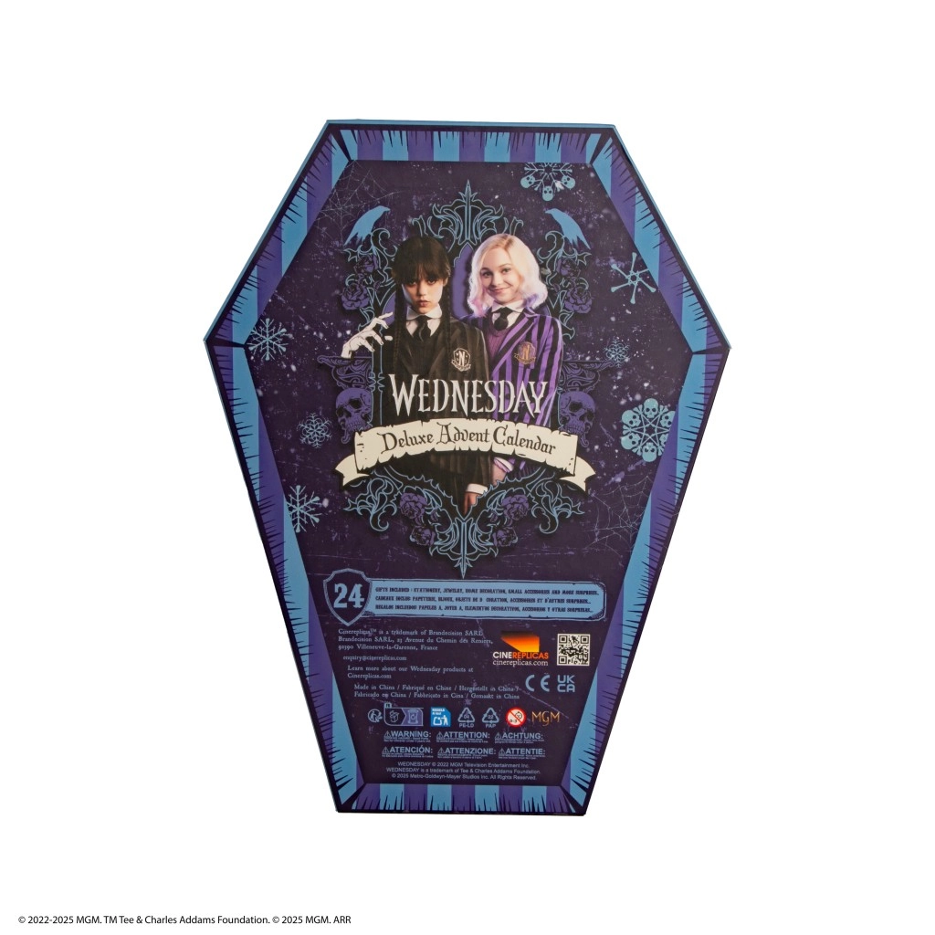Ten ekskluzywny kalendarz adwentowy w kształcie trumny zachwyci każdego fana WEDNESDAY. W środku znajdziesz starannie zaprojektowane przegródki z 24 tematycznymi niespodziankami, które łączą zabawę, praktyczność i wartość kolekcjonerską. Dzięki przykuwającemu uwagę designowi kalendarz świetnie sprawdzi się także jako dekoracyjny prezent na święta.